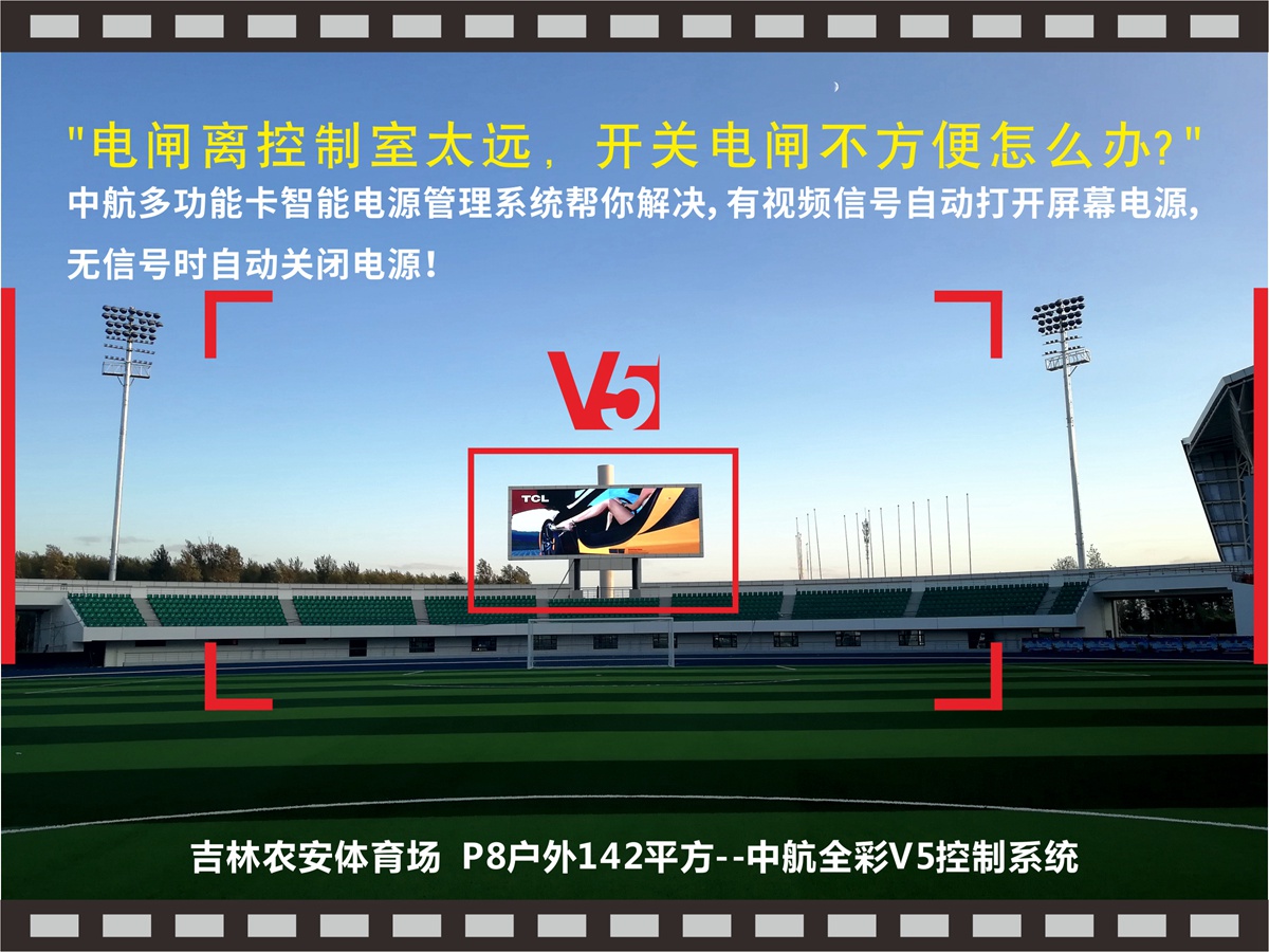 【中航V5精品案例選集】:“電閘離控制室太遠,開(kāi)關(guān)電閘不方便怎么辦”?中航多功能卡智能電源管理系統幫你解決,有視頻信號自動(dòng)打開(kāi)屏幕電源,無(wú)信號時(shí)自動(dòng)關(guān)閉電源!吉林農安體育場(chǎng),P8戶(hù)外142平方,中航全彩系統完美點(diǎn)亮。感謝長(cháng)春科美李總對中航的大力支持,我們會(huì )努力做的更好!