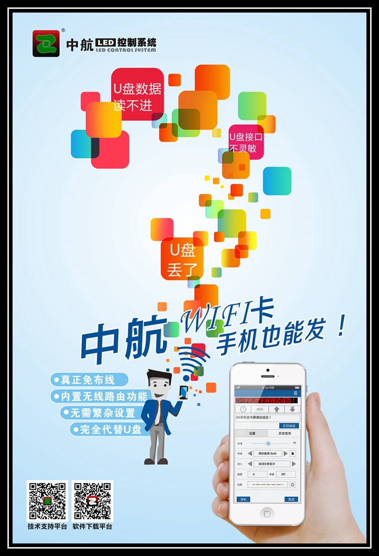 我公司推出V3WiFi控制系統,軟件操作簡(jiǎn)單好用,免布線(xiàn)、免U盤(pán)、無(wú)需連接寬帶,更無(wú)后期任何附加費用,高質(zhì)量方案,更容易被行業(yè)人員所接受使用,我們相信中航無(wú)線(xiàn)WiFi控制系統正在創(chuàng )造另一個(gè)神話(huà)——無(wú)線(xiàn)WiFi控制卡取代U盤(pán)控制卡成為市場(chǎng)主流產(chǎn)品。